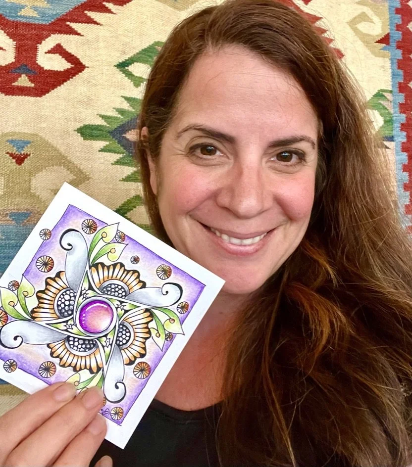 Romi Marks or aka The Tangled Yogi has been practicing Zentangle for 9 years but has had a relationship with creativity her entire life. The Zentangle method is an easy, relaxing and fun way to create beautiful images by drawing structured patterns. It increases focus, creativity, and provides artistic satisfaction while creating a sense of well being. It is Romi’s belief that Zentangle has given her creative work focus and direction. She has been practicing gentle yoga for nearly 20 years and learned about Zentangle from her yoga teacher. The fusion of yoga and Zentangle was a natural progression and life changing. While Romi’s methods are untraditional with the use of color, the journey and the destination are still the same: a deep sense of relaxation and gratitude for the creative process. Learning to use Zentangle as a meditative practice has brought balance and calm to her students and friends. She teaches many online class and developed an extensive youtube video library for her online students. She has also created a line of Zentangle inspired tiles that are available for purchase on her website at Tangledyogi.com. She received her certification CZT18 and has been teaching ever since. It is her desire to guide her students to a place of well-being and inspiration.